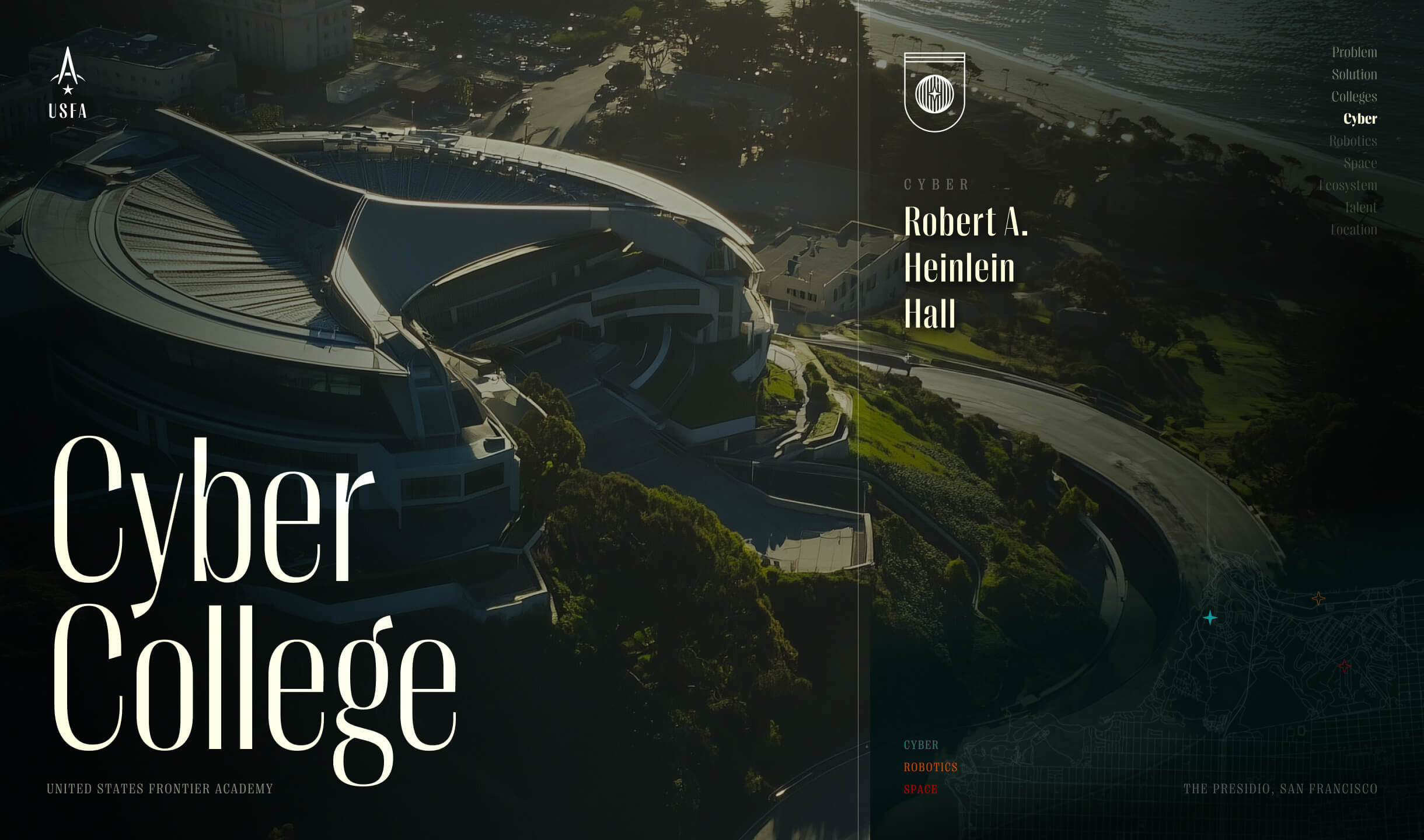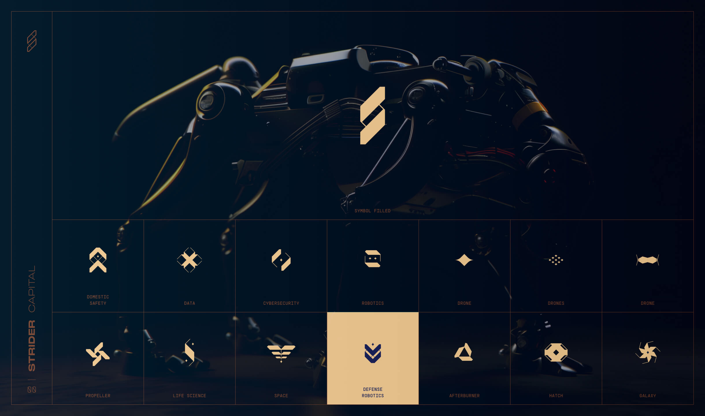 Corporate identity synthesizing finance, defense, cyber, robotics, space, and science fiction.
